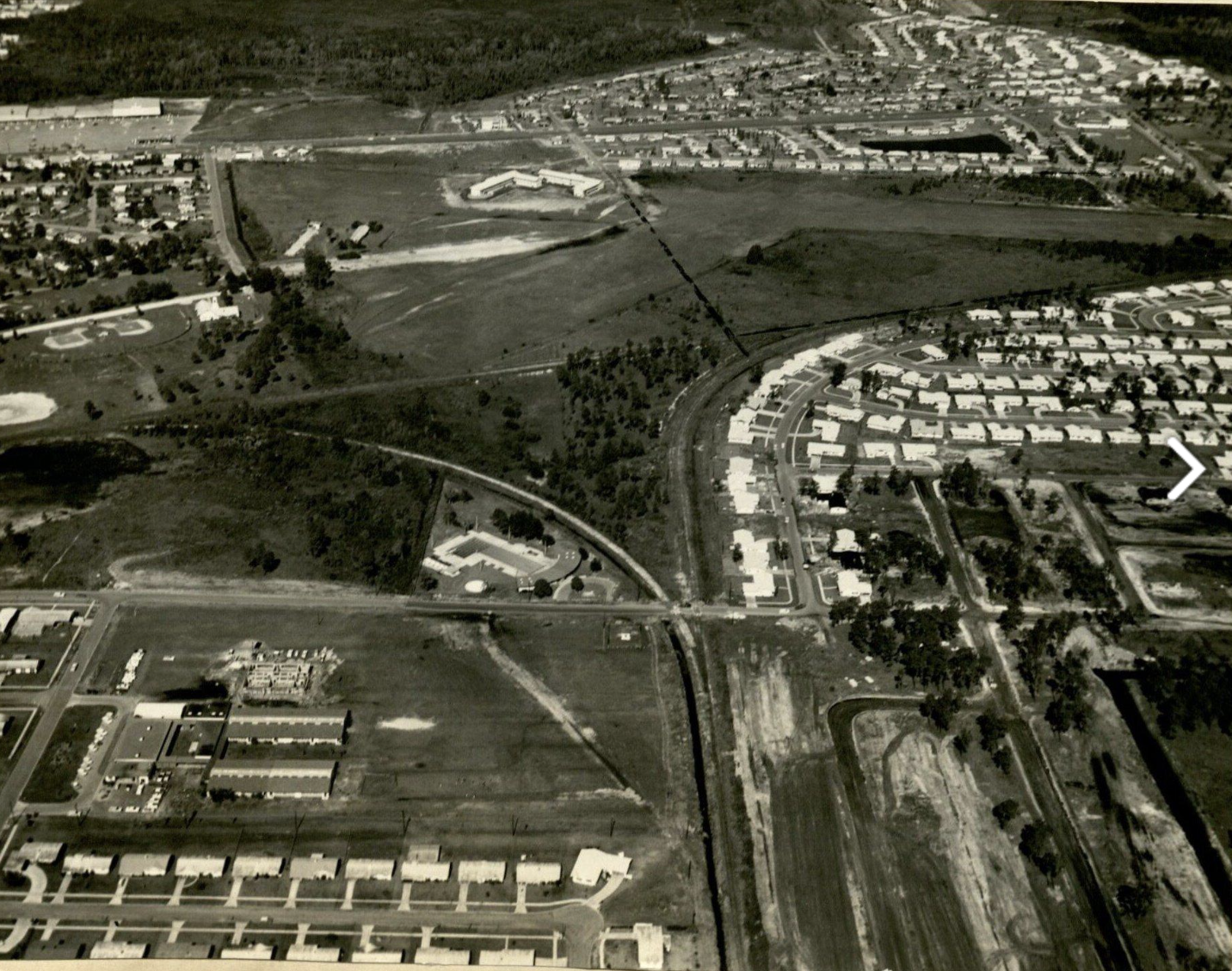 Top of the aerial photo shows the remains of the Showalter Airpark’s runways and the middle shows the Dinky Line railway curving around the Cady Way Pool. Credit: Orlando Memory